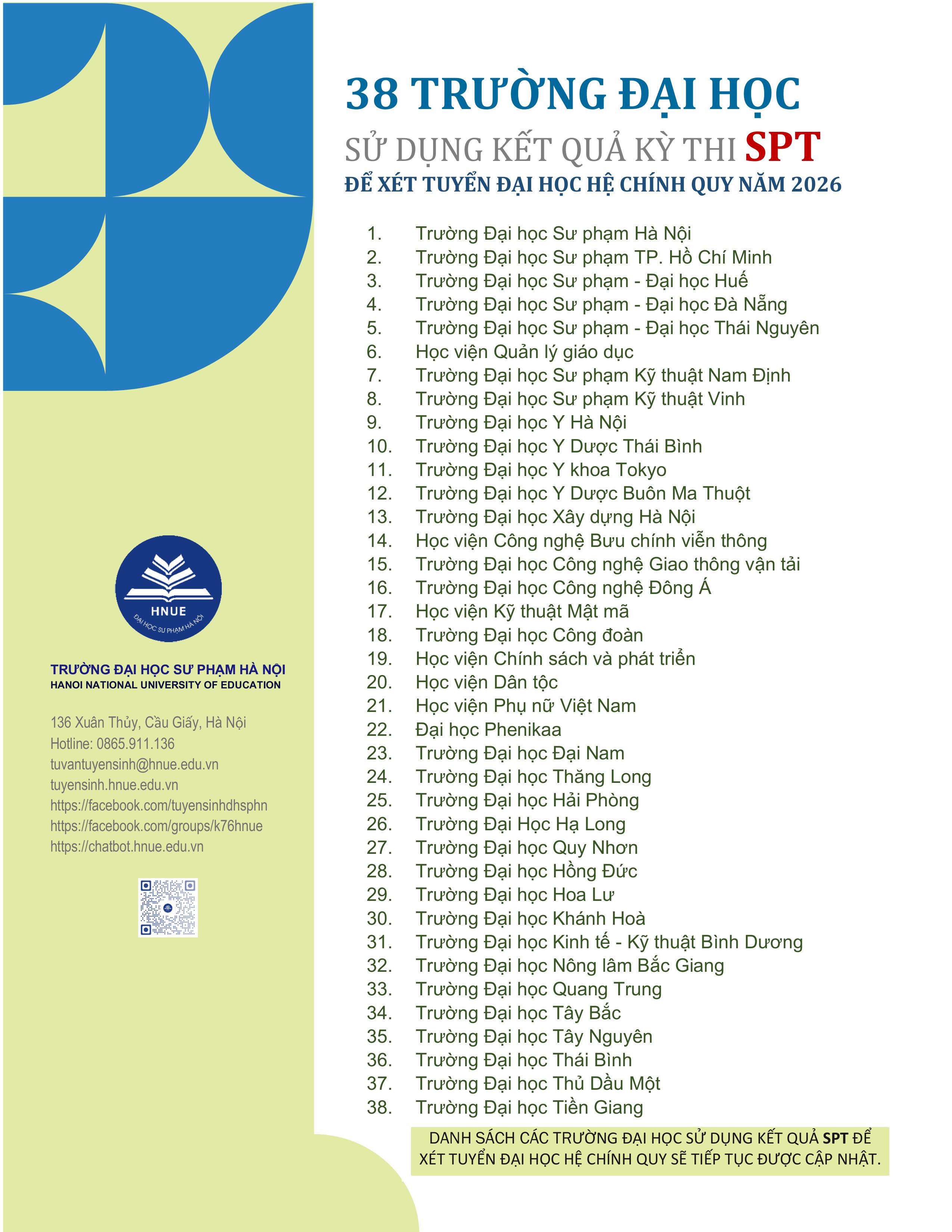 38 TRƯỜNG ĐẠI HỌC SỬ DỤNG KẾT QUẢ KỲ THI SPT ĐỂ XÉT TUYỂN ĐẠI HỌC HỆ CHÍNH QUY NĂM 2026 | Tuyển sinh (thong-bao) | Trường Đại học Sư phạm Hà Nội