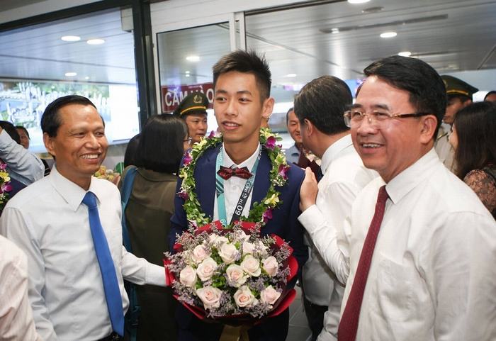Phó Chủ tịch UBND TP Hải Phòng Lê Khắc Nam (phải) và ông Nguyễn Xuân Trường, Giám đốc Sở GD-ĐT Hải Phòng (trái) đón Thuận Hưng. Ảnh: Thanh Tùng