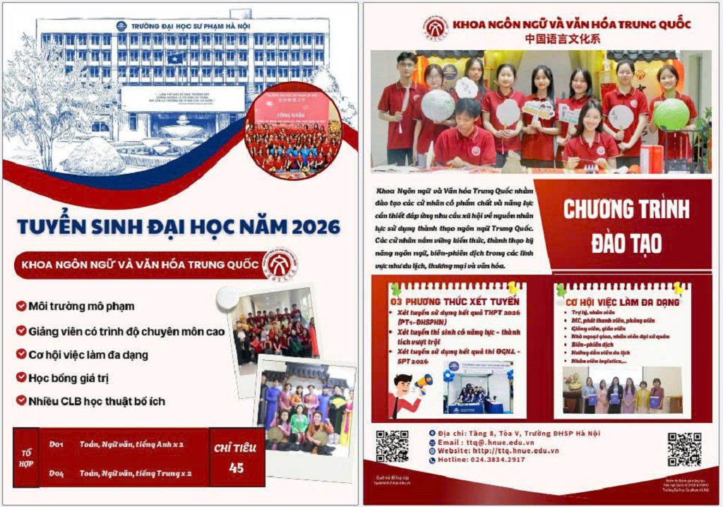 Năm 2026, Ngành Ngôn ngữ và Văn hóa Trung Quốc của Trường Đại học Sư phạm Hà Nội tuyển sinh 45 chỉ tiêu, mã ngành: 7220204. Ngành đào tạo cử nhân có khả năng sử dụng thành thạo tiếng Trung Quốc trong các lĩnh vực giao tiếp, biên – phiên dịch, thương mại, du lịch và giao lưu văn hóa. Chương trình học trang bị cho sinh viên nền tảng vững chắc về ngôn ngữ, văn hóa, xã hội Trung Quốc cùng các kỹ năng nghề nghiệp cần thiết trong môi trường hội nhập quốc tế. Sinh viên được học tập trong môi trường sư phạm, với đội ngũ giảng viên có chuyên môn cao, tham gia nhiều hoạt động học thuật, câu lạc bộ và cơ hội giao lưu quốc tế. Sau khi tốt nghiệp, người học có thể làm việc trong các lĩnh vực như biên – phiên dịch, truyền thông, du lịch, doanh nghiệp, giáo dục, ngoại giao hoặc các tổ chức trong và ngoài nước. Dự kiến phương án tuyển sinh xem tại: https://tuyensinh.hnue.edu.vn/tuyensinh2026/575